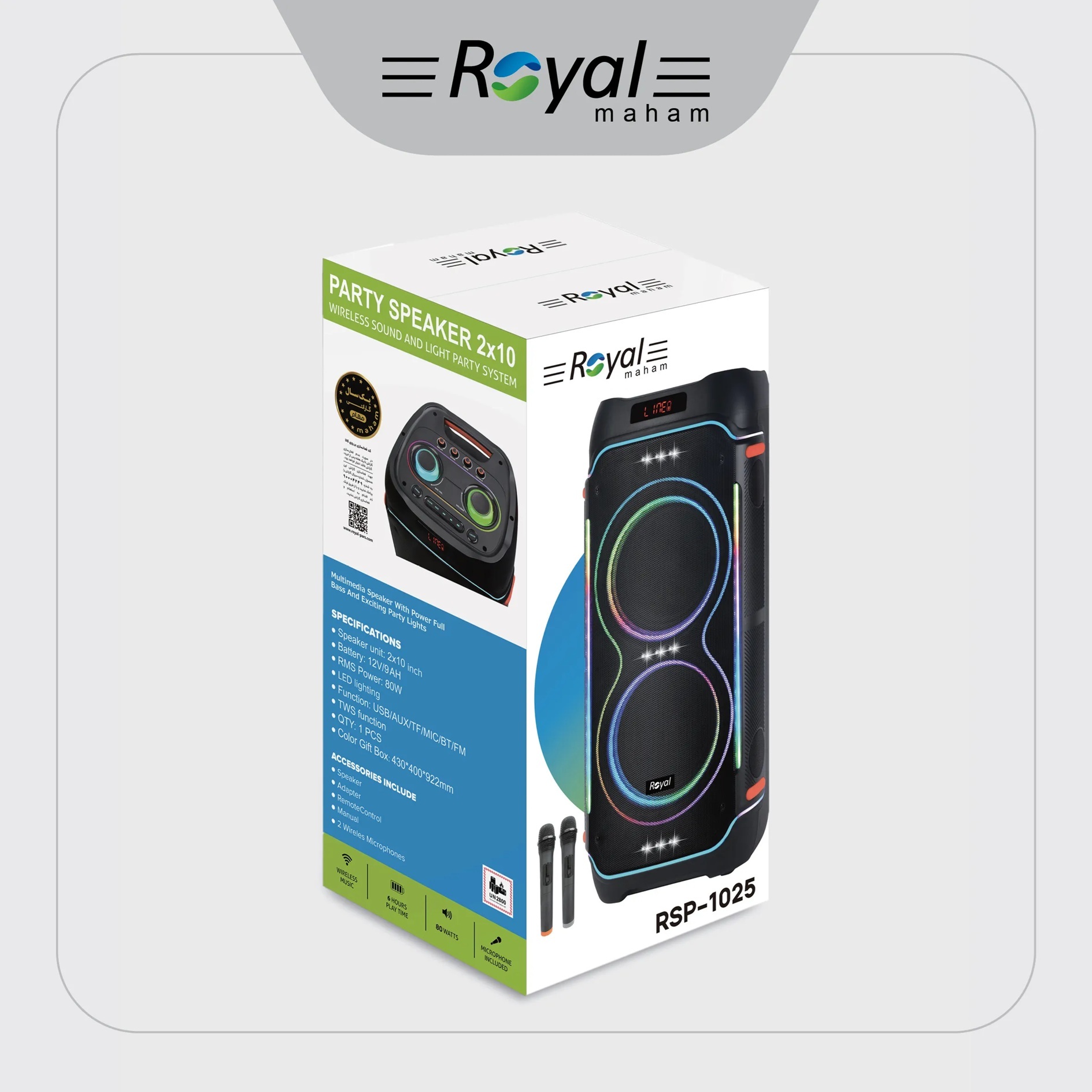 پارتیباکس رویال RSP-1025 محصولی توانمند، کارآمد و سبک از برند معتبر Royal است که با طراحی مدرن و امکانات پیشرفته وارد بازار تجهیزات صوتی مهمانی شده است. بدنهای از جنس پلاستیک مقاوم و سبک وظیفه حمل آسان را بهخوبی انجام میدهد، در حالی که دو ووفر ۱۰ اینچ با توان خروجی ۸۰ وات صدایی قدرتمند و شفاف ارائه میدهند.