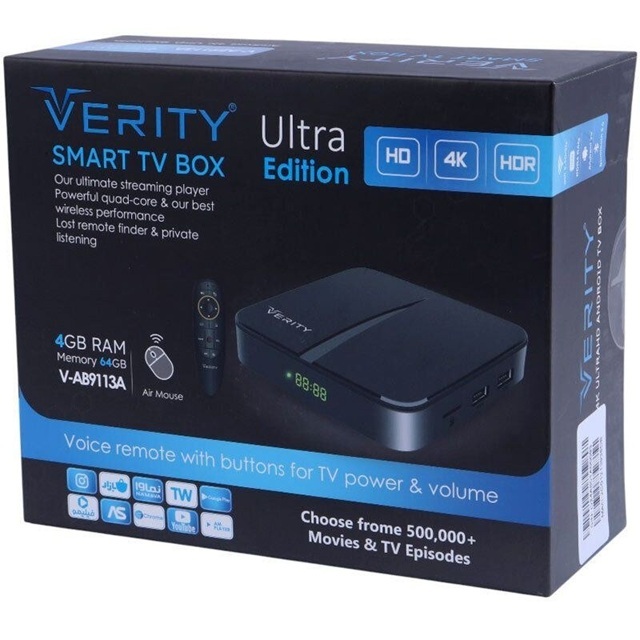 اندروید باکس VERITY 9113 همچنین از فناوری HDR10+ و Dolby Vision پشتیبانی میکند. که به شما این امکان را میدهد تا از تصاویری با کنتراست بالا و رنگهای زنده لذت ببرید. اقلام همراه این دستگاه شامل ریموت کنترل، ایرماوس، کابل HDMI، آداپتور برق، باتری و دفترچه راهنما است که استفاده از آن را بسیار آسان میکند.