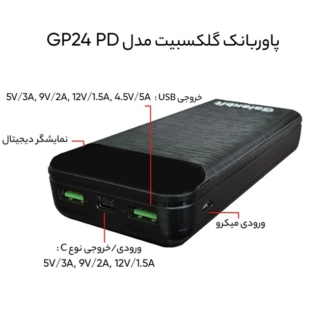 شارژر همراه (پاوربانک) گلکسبیت مدل GP24 PD که با گارانتی شرکت تلاش عرضه میگردد با توجه به ظرفیت بالایی که دارد و همچنین به دلیل پشتیبانی از انواع پروتکل های شارژ سریع و هوشمند بهترین همراه شما در سفر و کمپ های خارج از شهر می باشد و با استفاده از این شارژ هوشمند به راحتی میتوانید به طور همزمان دو دستگاه مختلف را با ولتاژ ورودی مناسب هر دستگاه شارژ کنید. این پاوربانک دارای یک درگاه (پورت) TYPE-C و دو درگاه (پورت) USB می باشد و یک درگاه (پورت) micro در طراحی ان از صفحه نمایش LED استفاده شده که نمایشگر درصد شارژ پاوربانک شما میباشد. این سری از پاوربانک های Galexbit دارای فناوری PD هستند و از استاندارد خاصی استفاده می کنند ، این استاندارد ها معمولا در دفترچه راهنمای پاوربانک ذکر شده که شامل این موارد می شود: 1 - ولتاژ بیش از حد نرمال (Over Voltage Protection) یعنی بتواند در برابر شدت جریان زیاد مقاومت کند. 2 - بیش از حد شارژ شدن (Over Charge Protection) یعنی بتواند انتقال نیرو را زمانی که شارژ پر می شود قطع کند. 3 - شدت جریان بیش از حد (Over Current Protections) یعنی زمانی که برق قطع و وصل می شود یا ولتاژ بالا می رود آن را خنثی کند تا آسیب به باتری یا پاوربانک نرسد. 4 - گرما (Over Heat Protections) یعنی بتواند در برابر حرارت بالا و بالا رفتن دما در اثر شدت جریان زیاد مقاومت کند. 5 - اتصال کوتاه (Short-Circuit) یعنی در برابر نوسان مقاوم باشد.